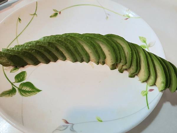 8.將半顆酪梨切成薄片,並用手將酪梨片慢慢位移如圖示。