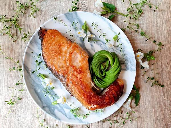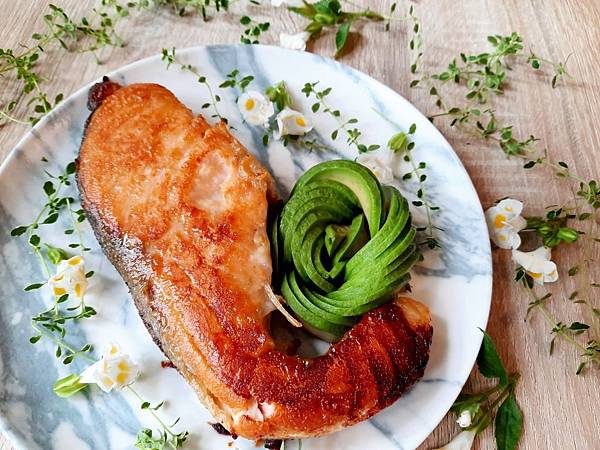 鮭魚富含高營養價值又好料理的魚類,先將鮭魚煎到酥脆再加入味噌蜂蜜醬汁,放上一朵酪梨玫瑰,再以百里香和夏堇點綴,在家也能做出餐廳級的視覺系美味料理。雖然只是在家吃飯,我喜歡用花園裡的當季的香草或花卉讓料理更精緻, 創造不同的風格也帶來驚喜。最近我的百里香和夏堇實在是長得太茂盛了,便從花園裡剪些香草來裝飾這道鮭魚料理。